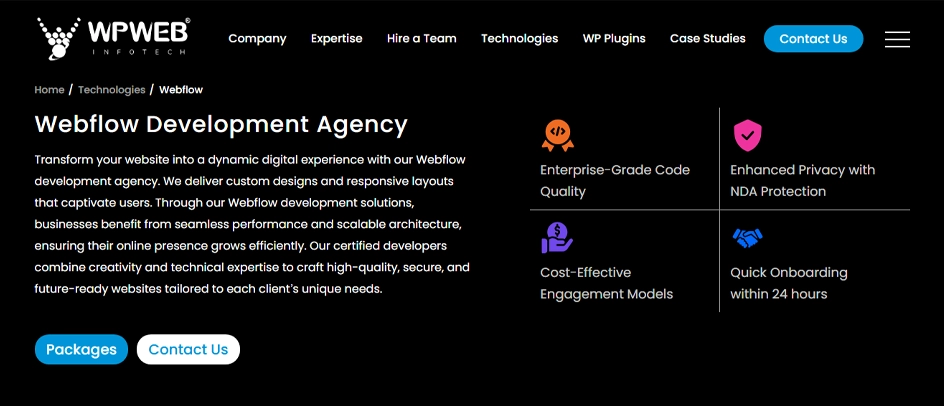 WPWeb Infotech is a well-known company that offers end-to-end Webflow development services. With 10+ years of industry experience and 250+ successful projects, they are our first recommendation for any Webflow requirement.